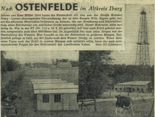 Im August 1952 wurde mit dem Landwirt Wilhelm Eggert sen. ein Pachtvertrag abgeschlossen, um auf einer Teilfläche des Geländes "Auf den Äckern" (Gemarkung Ostenfelde, Flur 9, Flurstück 162) in Ostenfelde Erdgas zu erbohren. Bohrunternehmer war die Wintershall Aktiengesellschaft - Erdölwerke Emsland -. Vorab wurde der an der geplanten Bohrstelle vorbeiführende Weg ausgebaut, um die schweren Materialien befördern zu können, die zur Errichtung und Inbetriebhaltung eines Bohrturmes, der sich ca. 30 m von der heutigen Straße "Auf den Äckern" befand, notwendig sind. Dann wurde ein Betonfundament erstellt, auf dem ein Stahlgitterturm errichtet wurde. Für die zum Bohren benötigte Spülung musste zuvor eine Brunnenbohrung geteuft werden.
